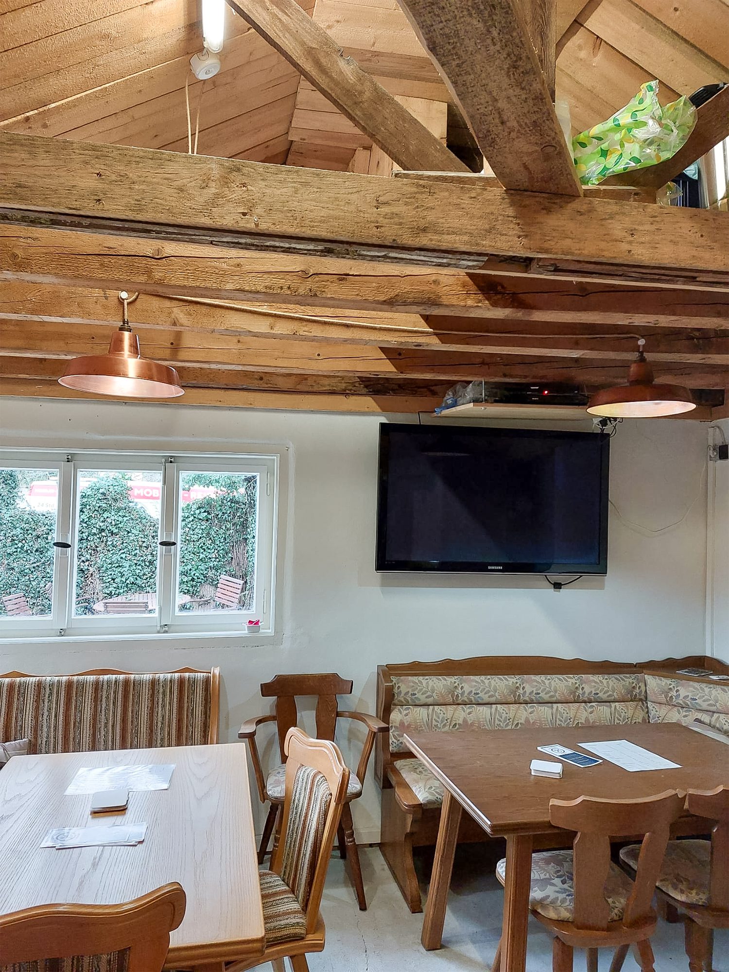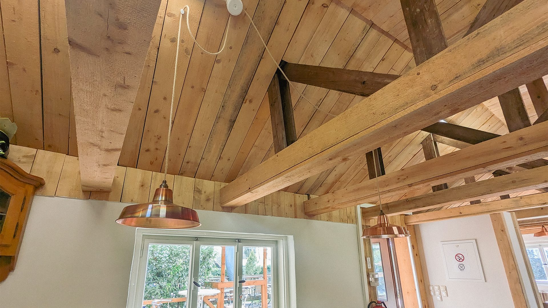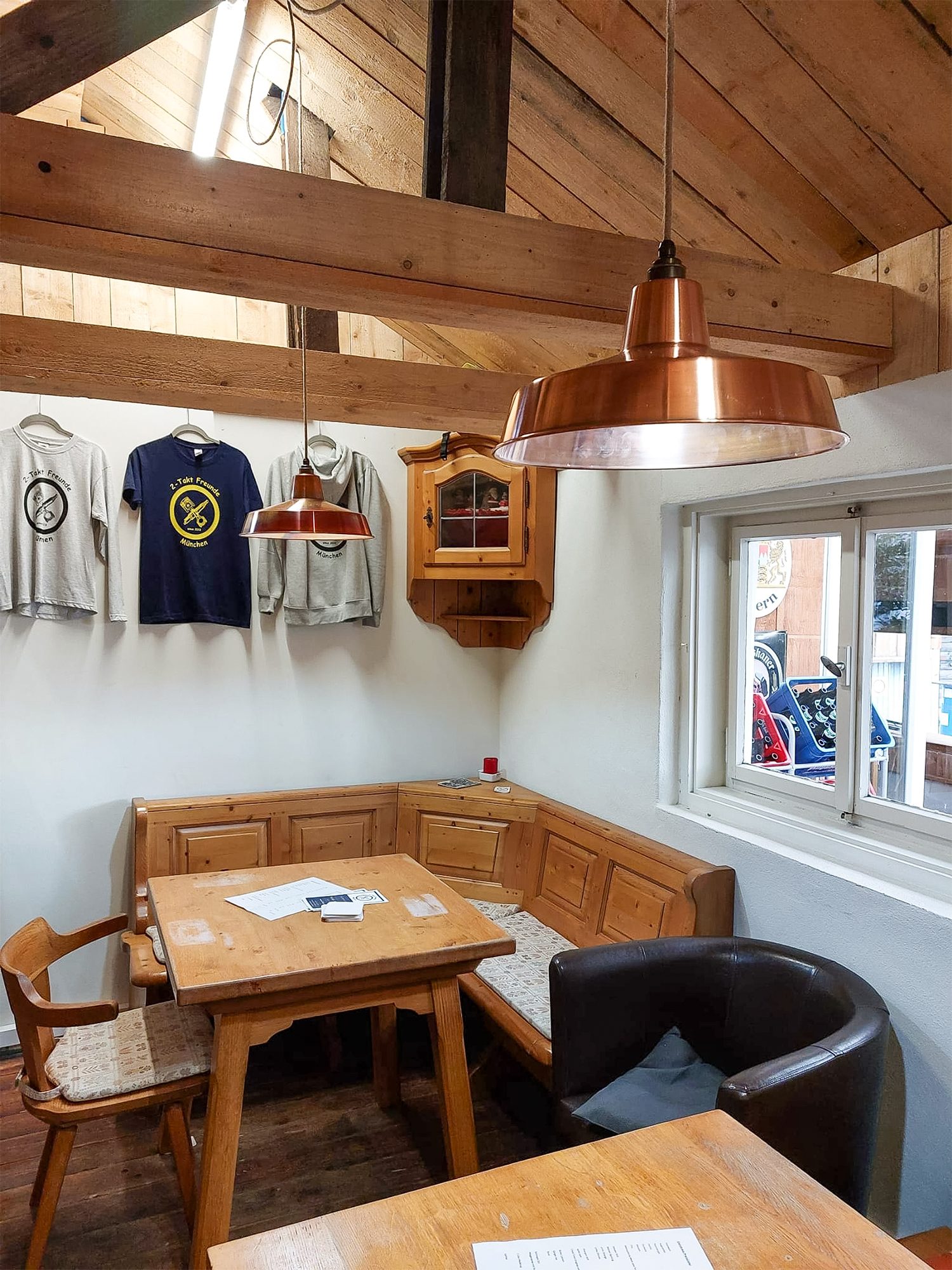 In diesem prächtigen Schwarzbau hat man an alles gedacht – nur eben nicht ans Licht. Und weil es die 2-Takt-Freunde in München gerne schmierig und raw mögen, haben sie sich für die Lampenschirme aus rohem Kupferblech entschieden. Seither geht ihnen drinnen ein Licht auf – und Sie sehen, was sie saufen. Motoröl adé, hello Whiskey – so leicht lässt sich mit dem richtigen Licht das Glas, oder auch die Stimmung, heben.