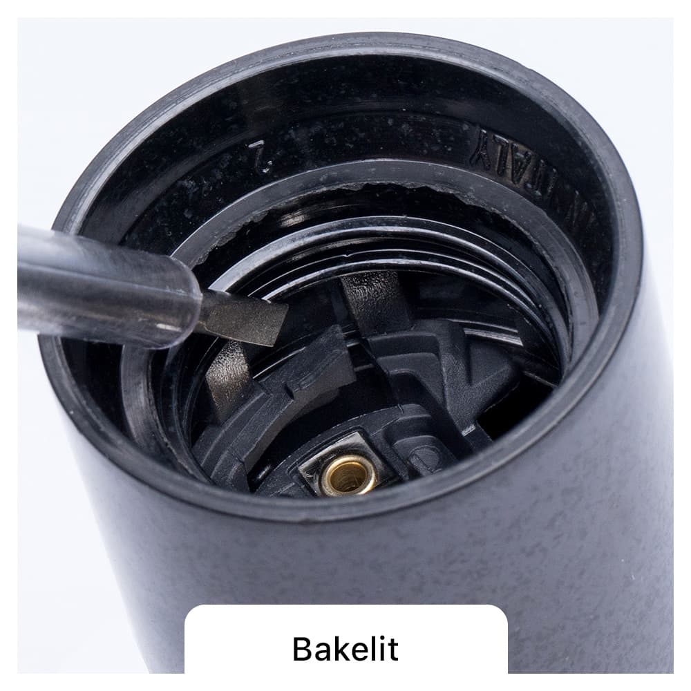 Denn auf dem sog. Fassungsstein, also an der Stelle, an der die Kontakte (fachmännisch: Litzen) angeschlossen werden, sitzt an der Außenkante ein Nippel, der in die Kanneluren des Fassungsmantels einrastet. Dieser Mechanismus bildet die Mantelsperre. Sie sorgt für eine Verriegelung der Fassung. Beim Versuch die Lampenfassung zu öffnen blockiert der im Mantel eingerastete Nippel nun.