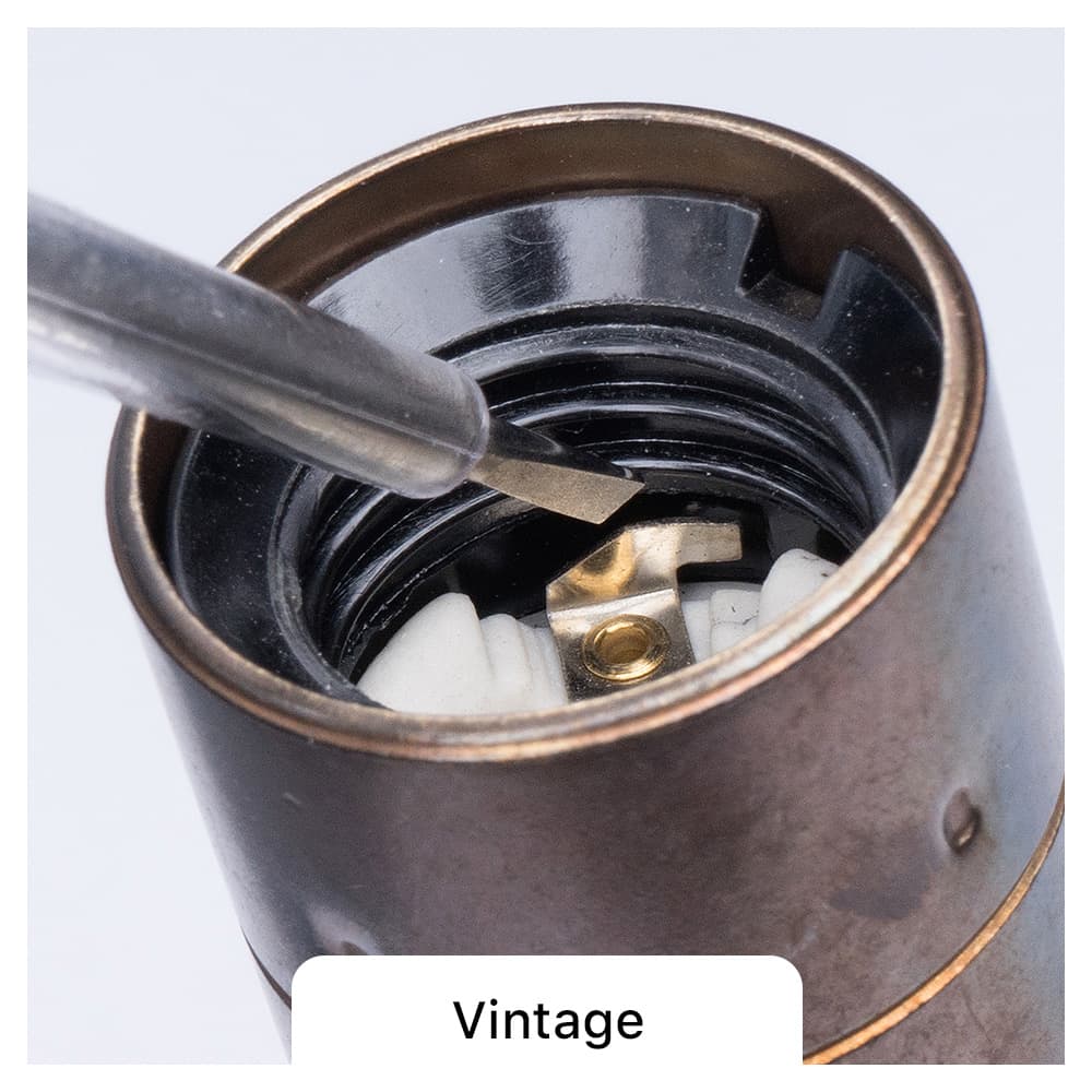 Aber wie öffnen Sie die Lampenfassung nun wieder? Unseren Kunden stellen wir hier nochmals einen kleinen Guide zur Verfügung, dem Sie die Position der Mantelsperre entnehmen können. Dazu wählen Sie aus den Bildern zunächst diejenige Lampenfassung aus, die Sie von uns erhalten haben. Bevor Sie mit der Arbeit anfangen, unterbrechen Sie unbedingt den Stromkreislauf an Ihrem Sicherungskasten! Der Schraubenzieher zeigt auf den jeweiligen Mechanismus, der die Fassung verriegelt. Drücken Sie nun den Nippel wahlweise nach unten oder in Richtung des Mittenkontaktes, während Sie den Fassungsmantel aufdrehen. Nach diesem Prinzip funktionieren im Übrigen die meisten Lampenfassungen, sollten Sie mal eine Fassung haben, die nicht von uns kommt. Und wenn mal doch etwas nicht klappen sollte, rufen Sie uns gerne an: 089 24405061 oder schreiben Sie uns via E-Mail: licht@lightstock.de